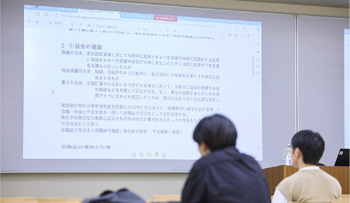 聞いていた山口英士さん(3年生)は、「長田さんの発表で十分に理解したと感じていましたが、先生から『なぜ引当金は負債なのか』と問われると答えに窮しました。改めて先生が解説してくださったことで整理ができました」と感じたそうです。