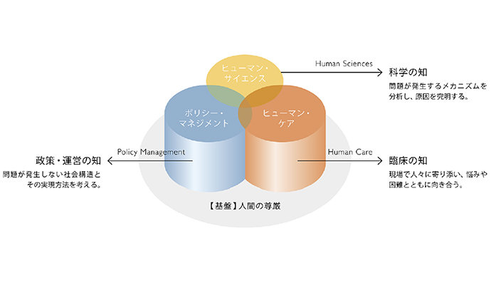 各学科のカリキュラムは、ヒューマン・サイエンス(科学の知)、ポリシー・マネジメント(政策・運営の知)、ヒューマン・ケア(臨床の知)の「知の3本柱」を核として構成されています。専門領域を深くかつ幅広く学ぶとともに、人や人を取り巻く環境に目を向け、現代社会そのものについて理解を深めていくのが特徴です。