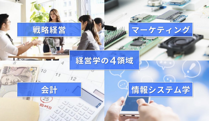 経営学部では、「戦略経営」(ヒト)、「マーケティング」(モノ)、「会計」(カネ)、「情報システム学」(情報)という4つの領域に分けて経営学を学びます。