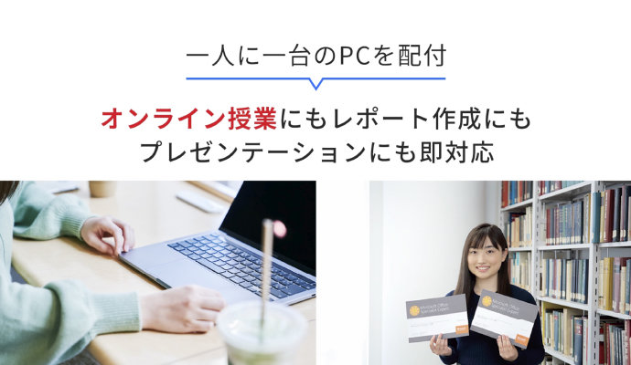 また、一人につきノートパソコンを1台配布しますので、プレゼン資料やレポートの作成などに活用できます。卒業後は返却の必要はありませんので、卒業後も安心して長く使っていただけます。