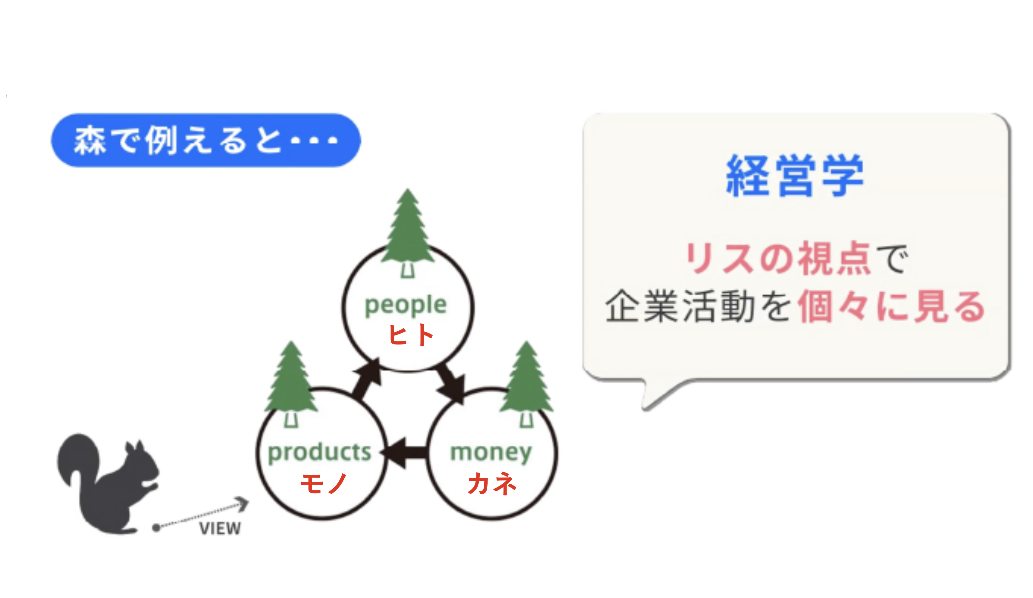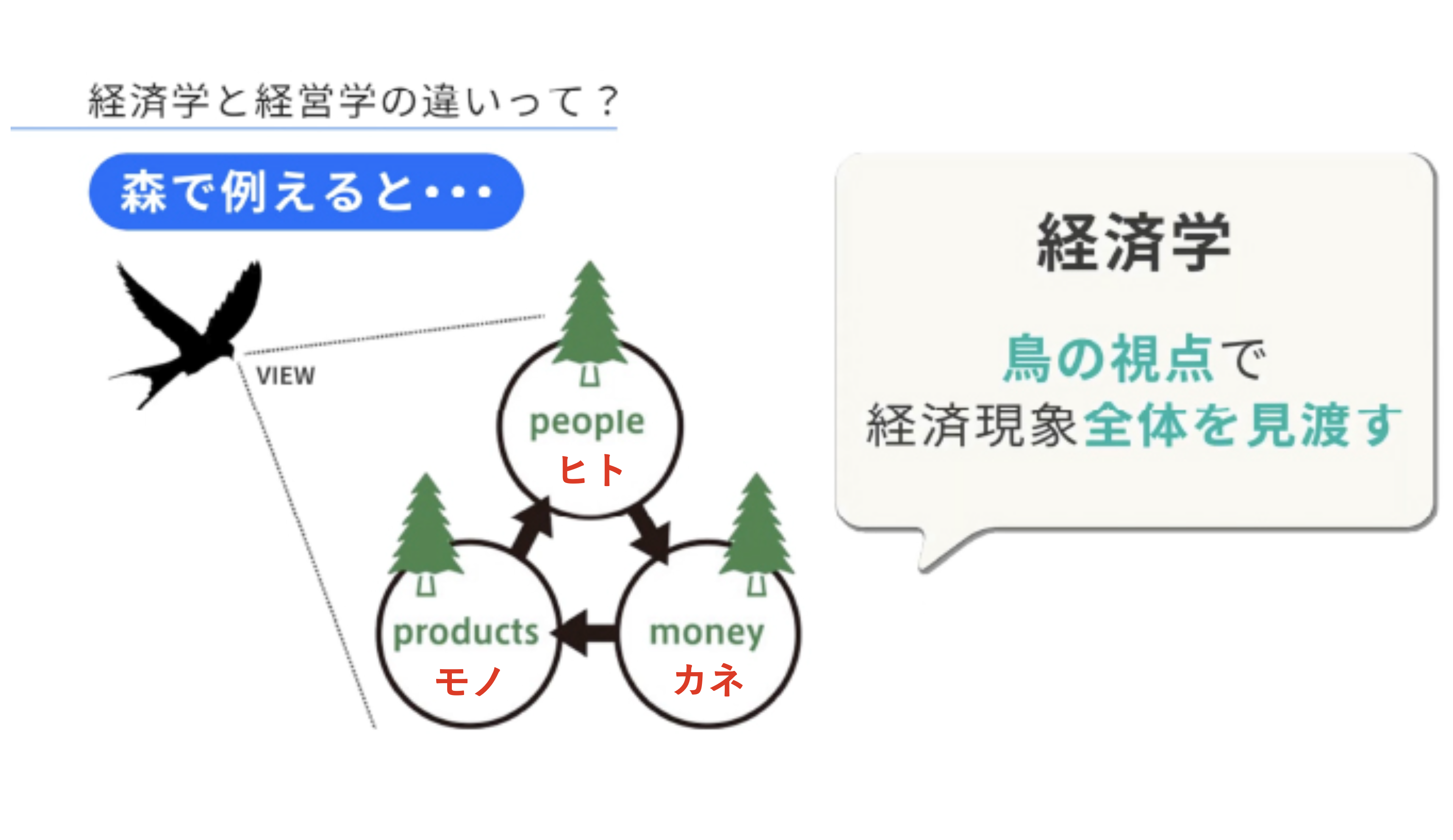 森で例えると、経済学は鳥の視点で森全体を見渡し、経営学はリスの視点で木を見る学問です。経済学は、企業がモノをつくり人が買うことで「日本の経済や景気」に与える影響について国や地方自治体を中心にして考え、経営学は、私たちが支払ったお金が「企業」にどのような影響を与えるかについて組織を中心にして考えます。