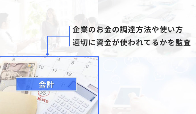企業のお金の調達方法や使い方、適切に資金が使われているか監査する方法を学ぶのが会計です。経営資金を集める方法、物をつくるためのコストの計算、実際に使った金額の計算と利益の出し方など、「お金」の観点を中心に経営を学びます。