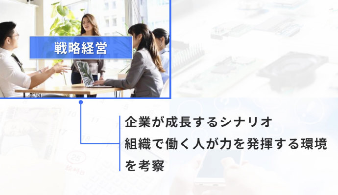 戦略経営では、企業が成長するシナリオや組織で働く人が力を発揮する環境を考察。