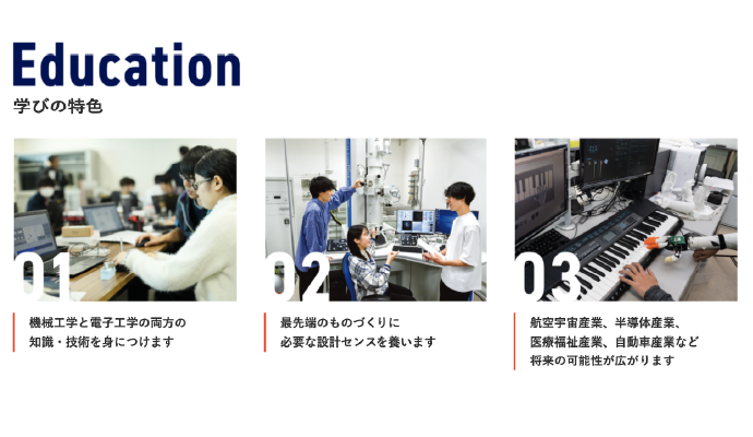 さらに、機械・電子技術に関する基本原理、機械・電気電子関連の工業製品を実際に開発する能力など、実践的な能力を身につけていきます。