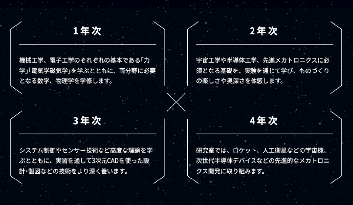 具体的に1年次は、機械工学、電子工学のそれぞれの基本である「力学」「電気学磁気学」を学ぶとともに、両分野に必要となる数学、物理学を学修します。CADによる設計・製図の基礎を学ぶ「デジタルものづくり」や宇宙の環境を学ぶ「宇宙理工学概論」など、専門の学びもはじまります。